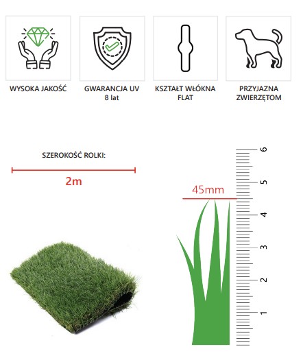 Cena dotyczy 1 mb o szerokości 2 mb = 2 m2Sztuczna trawa Multigrass Fogo 47 mm to estetyczna i trwała nawierzchnia syntetyczna, która tworzy efekt naturalnego, zielonego trawnika bez potrzeby podlewania, koszenia czy nawożenia. Gęste i miękkie włosie o wysokości 47 mm zapewnia komfort użytkowania i przyjemny wygląd przez cały rok. Trawa jest odporna na warunki atmosferyczne oraz promieniowanie UV, dzięki czemu zachowuje intensywny kolor przez długi czas. Produkt o szerokości rolki 2 m sprawdzi się w ogrodach, na tarasach, balkonach i innych przestrzeniach zewnętrznych, a także w strefach rekreacyjnych.