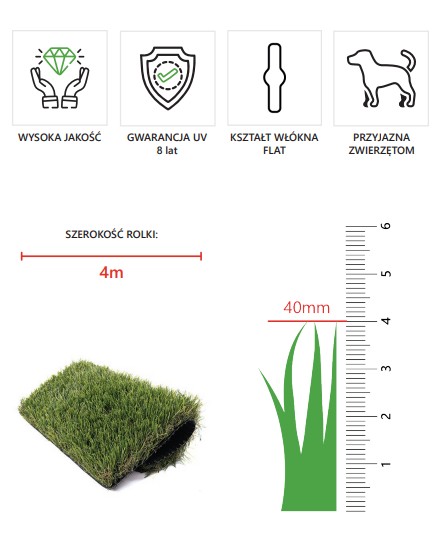 Trawa jest odporna na warunki atmosferyczne oraz promieniowanie UV, co gwarantuje długotrwały efekt estetycznej zieleni. Szerokość rolki 4 m ułatwia pokrycie większych przestrzeni z mniejszą liczbą łączeń, co przekłada się na bardziej estetyczny efekt końcowy. Produkt sprawdzi się w ogrodach, na tarasach, balkonach oraz w przestrzeniach rekreacyjnych i komercyjnych.